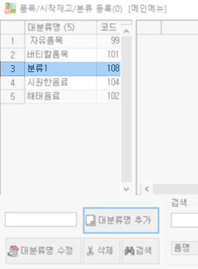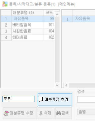 대분류를 신규로 등록하기 위해 빈 칸에 "분류1" 을 입력 후 [대분류명 추가] 버튼을 클릭합니다. 그럼 대분류명에 [분류1] 이 생성된 것을 확인할 수 있습니다.