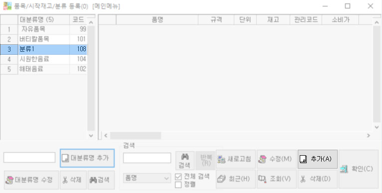 입력하고자 하는 품목이 등록될 대분류를 먼저 선택한 후, 하단의 추가버튼을 눌러주세요.