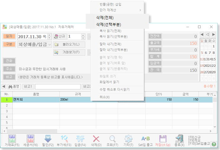 거래명세표입력에서 입력한 내용을 삭제하는 방법
