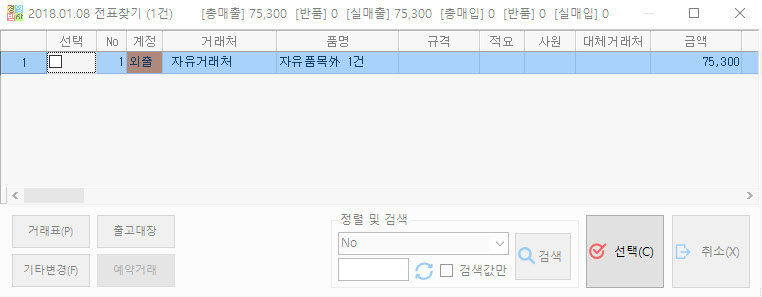 원하는 날짜에 입력한 모든 전표들이 아래의 그림과 같이 나타나면, 원하는 전표를 클릭하고 선택 버튼을 눌러주세요.